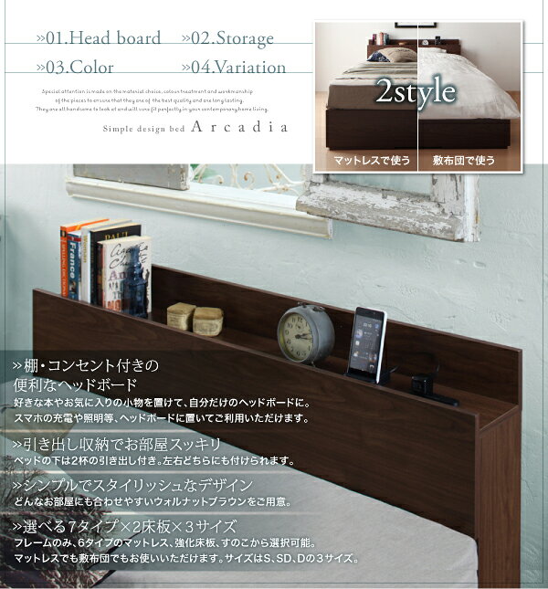 収納ベッド セミダブル 棚付き コンセント付 Arcadia アーケディア 床板仕様 マルチラススーパースプリングマットレス付き 引出し収納付き 布団可能 セミダブルベッド マットレス付き マット付き