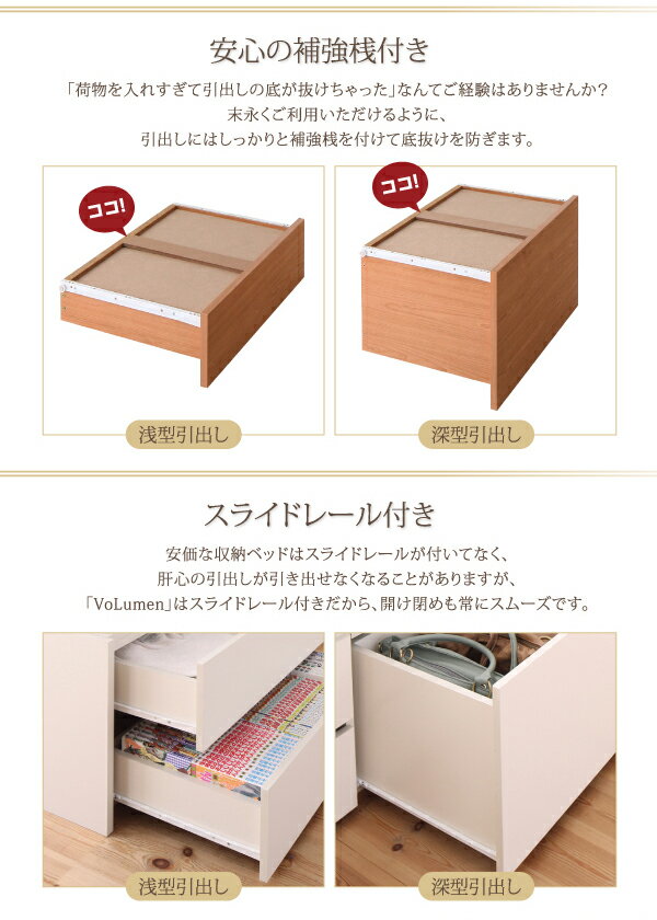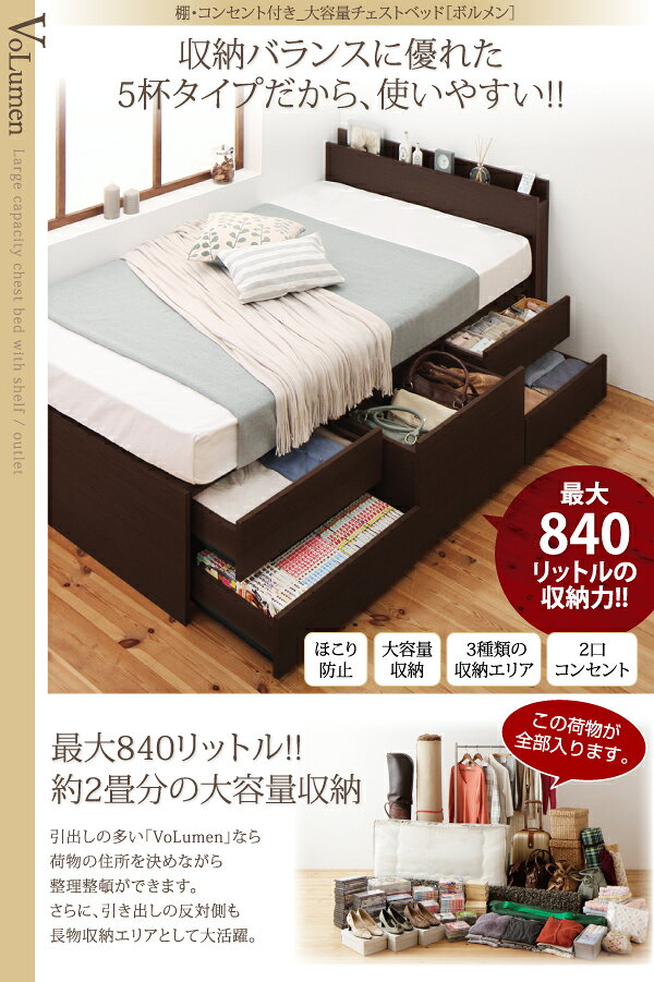 商品名棚・コンセント付き 大容量チェストベッド VoLumen ボルメン マルチラススーパースプリングマットレス付き セミダブル商品スペック【サイズ】 セミダブル :199×120×40cm 【収納部有効内寸】 浅型引き出し:55×38.5×13cm 深型引き出し:55×38.5×33cm 長物収納 セミダブル :195×37×72cm 【材質】プリント化粧板 【生産国】台湾 【カラー】ダークブラウン/ナチュラル/ホワイト 【耐荷重】200kg ※お客様組み立て ※プラスドライバーをご用意いただき、必ず2人以上で作業を行ってください。
