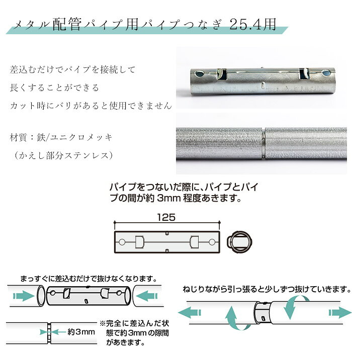 メタル配管パイプ用 パイプつなぎ25.4用 ・差込むだけでパイプを接続して長くすることができるカット時にバリがあると使用できません ■材質:鉄/ユニクロメッキ(かえし部分ステンレス) ※返品・交換・キャンセルのできない商品です。