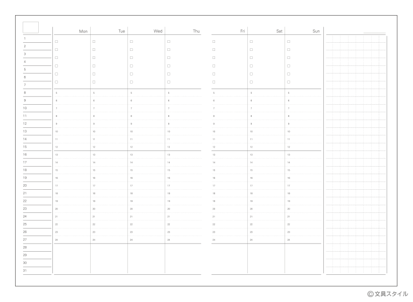 日付のないフリーの週間スケジュールのA5サイズノートリフィルです。